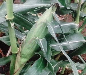 中ほどにある雌穂と呼ばれる雌花に受粉して実ができます。